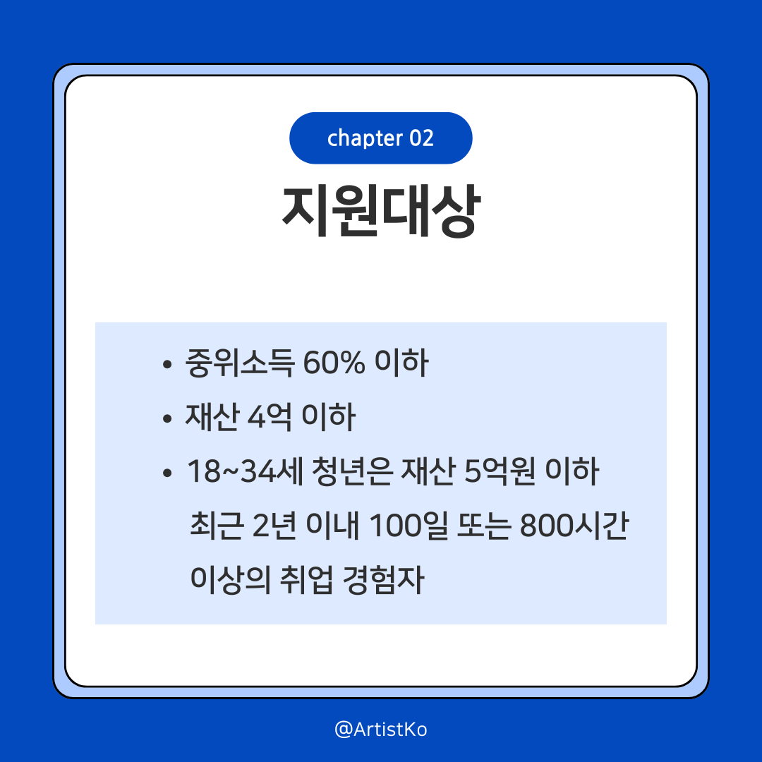 - 청년(18~34세): 중위소득 120% 이하, 재산 5억 원 이하